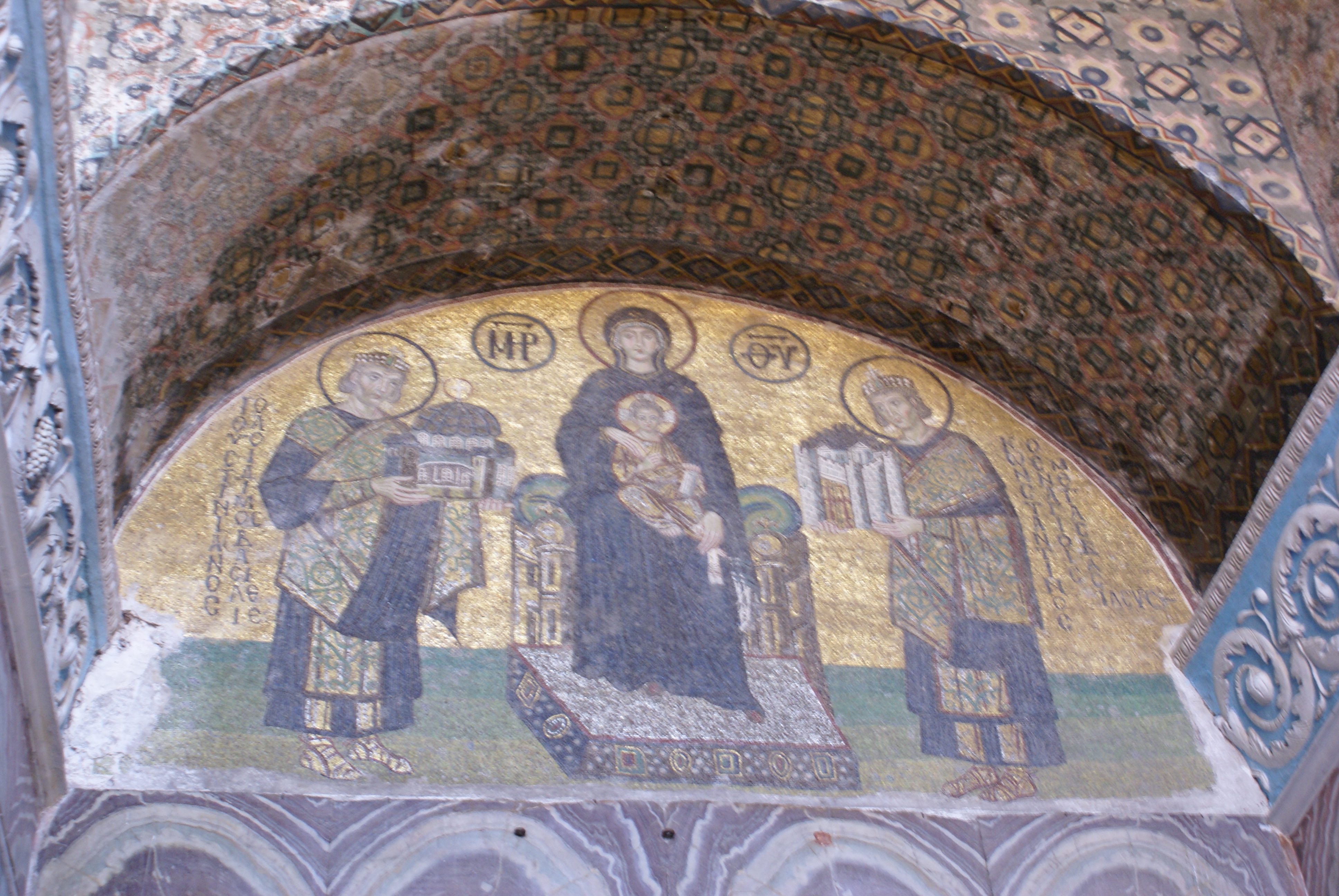 11. And don’t forget to look up as you exit. There’s a big mirror there which reflects a gorgeous 10th century paint-and-mosaic mural of the Virgin Mary seated on a throne with the infant Jesus in her arms. Emperor Constantine the Great is at her left, presenting them with a model representing the city and the Emperor Justinian is at the right, with a model of the Hagia Sophia. We almost missed it, so be careful. And there’s this simple faucet and basin carved into the wall right outside the exit. Way cool.