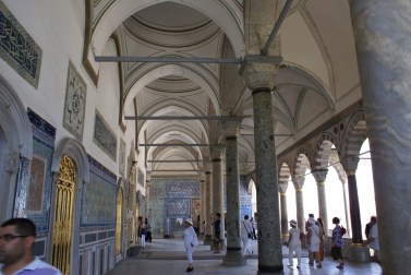 In my earlier conversation with Gem he’d advised me that the lines at the Blue Mosque would be long and the atmosphere inside much more reverential than the Hagia Sophia. After all, one’s a mosque and the other a former mosque turned museum. Women must cover their heads, for example. And compared to the HS, the highlight of the BM is the interior tilework, 20,000 handmade ceramic tiles in more than fifty different tulip designs. But as far as the overall impact, the HS has it beat. Or so he said. In any case, we turned north and east for the Topkapi Palace.
