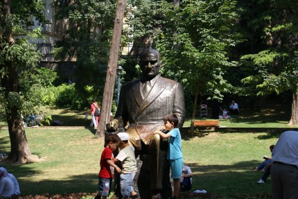 14. When we left the Palace we continued north through the expansive Gülhane Park which surrounds Topkapi Palace on its north and west sides. The park is one of the more enjoyable I’ve ever been in. Fountains, statues, some of animals just large enough for children to sit on, and others of Mustafa Kemal Atatürk, founder and first president of the modern Turkey. He’s a popular guy; there are statues of him all over the city. And my impression is that the people like having the statues around; that they truly appreciate what he did to create the nation they live in. As it was Sunday the park was absolutely packed with people, including many families enjoying mid-afternoon picnics. And again I was struck by the blend of religious traditions represented.